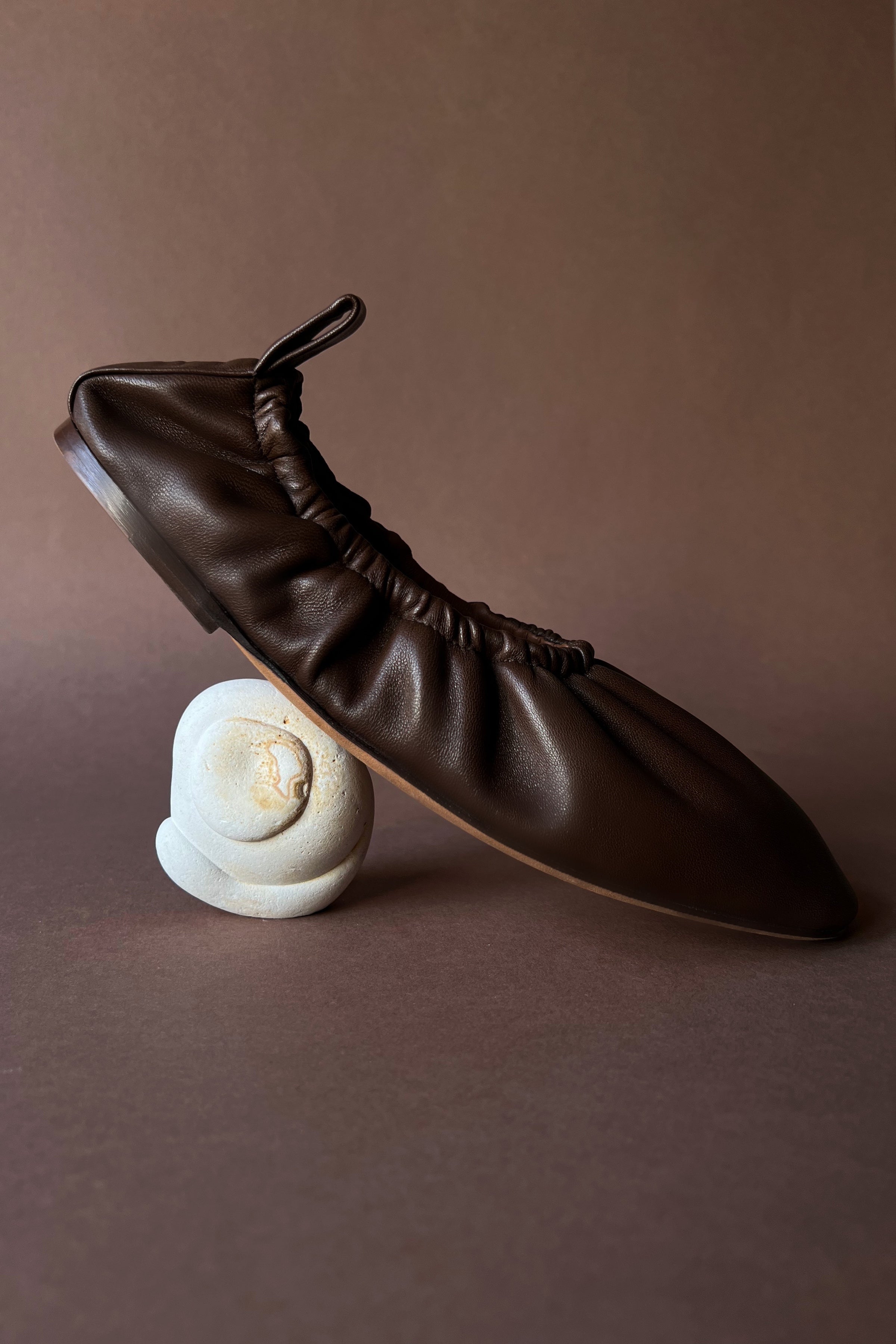 CHF 455.00Glove Ballerina Flats in soft walnut nappa leather, lining and sock in tan nappa leather, memory foam insole for extra comfort, cognac genuine leather sole and ambra rubber tip.
