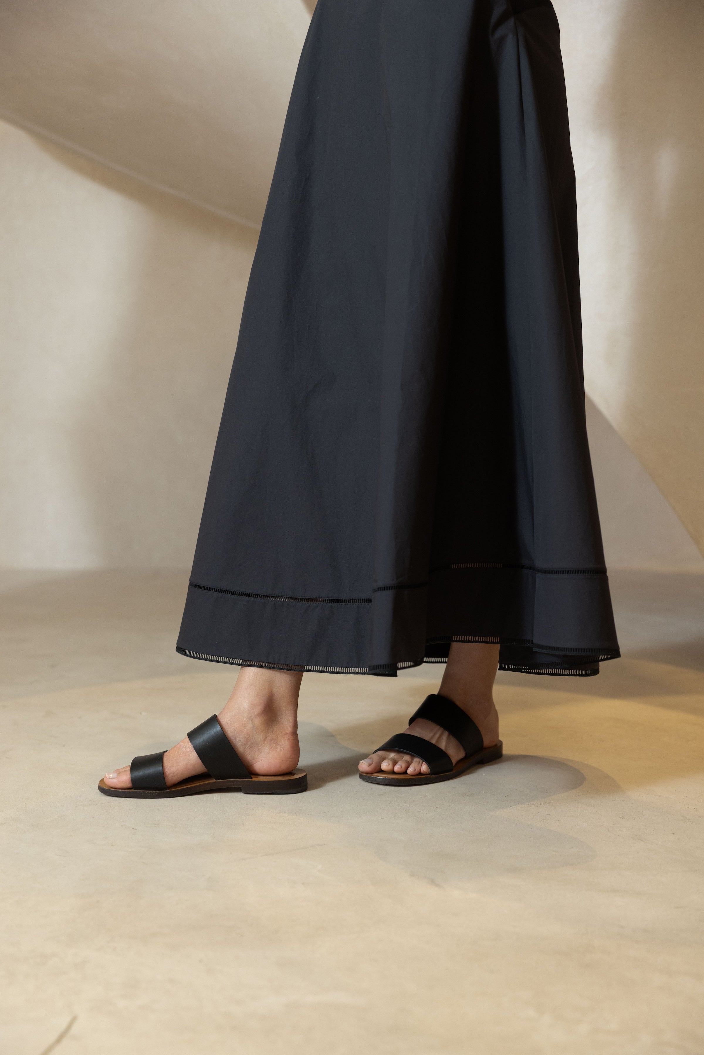 CHF 371.00Double-Band Slide Sandals in full grain black calfskin leather, lining and sock in tan calfskin leather, memory foam insole for extra comfort, cognac genuine leather sole and ambra rubber tip.